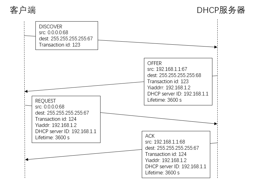DHCP 使用 UDP 协议,所以整个过程中接收端口均为 67,发送端口为 68。