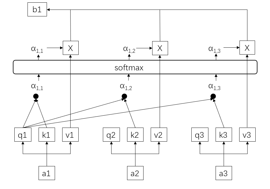对于输入的每个词 \(a_i\),都会被用共享的可被训练的权重矩阵生成三个新的向量\(q_i\)、\(k_i\)、\(v_i\):