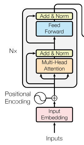 输入的词都会被进行一次 embedding 再与 positional encoding 得到的向量相加送入 encoder。每个 encoder 都由一个多头注意力层和一个前向反馈网络层组成。每个子层输出都会与输入相加再进行一次 Normalization(Add&Norm),即每个子层输出为 \(LayerNorm(x+SubLayer(x))\)。Transformer 会将此过程重复 6 次,也就是通过 6 次 encoder。