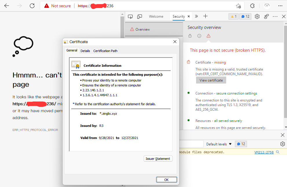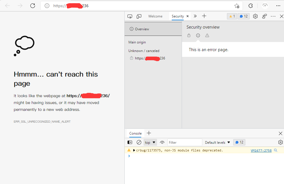 配置后,再尝试 IP 访问,会发现浏览器报了 ERR_SSL_UNRECOGNIZED_NAME_ALERT